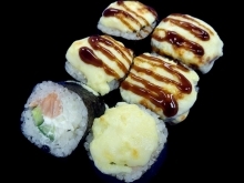 Рис, сыр, жаренный лосось, огурец, икра масаго, моцарелла, соус терияки