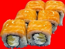 Рис, лосось, крем-краб, огурец, икра масаго.