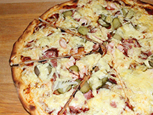 Пицца-соус, бекон, сервелат,курочка копченая, томаты, корнишоны, сыр, лук.(31см)