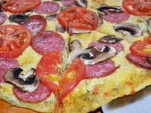 Пицца-соус, охотничьи колбаски, сыр, шампиньоны, перец, лук, орегано.(31см)