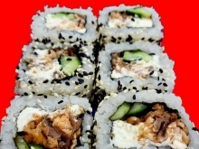 Рис, сыр, огурец, угорь,лосось, унаги соус, кунжут