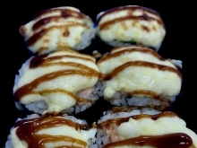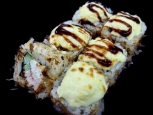 РИС ,НОРИ, СЫР, ЛУК ЗЕЛЕНЫЙ, ПОМИДОР, КУРИЦА КОПЧЕНАЯ, МОЦАРЕЛЛА, МАЙОНЕЗ,ПОЛИВАЕТСЯ ТЕРИЯКИ СОУСОМ.