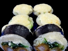 Рис, сыр, огурец, водоросли чука, креветка в кляре, ореховый соус, моцарелла