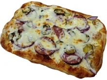 Пицца-соус, сервелат, перец болгарский, маринованные огурчики,маслины, помидоры, сыр.(31см)
